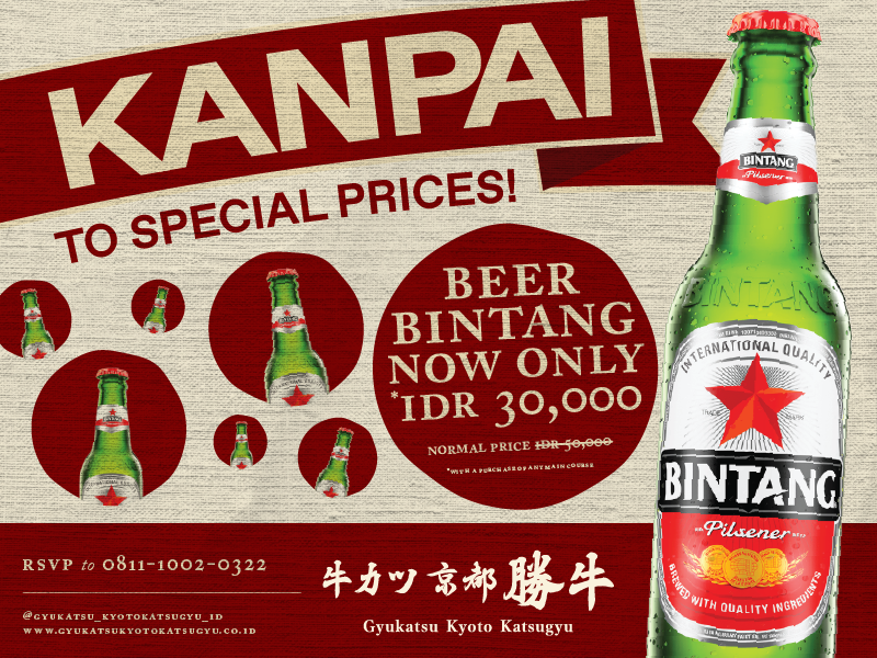 Gyukatsu Kyoto Katsugyu Kanpai to Special Prices! Beer Bintang Now Only IDR 30,000! Sub title Component PROMOTION ENDED Gyukatsu Kyoto Katsugyu View More